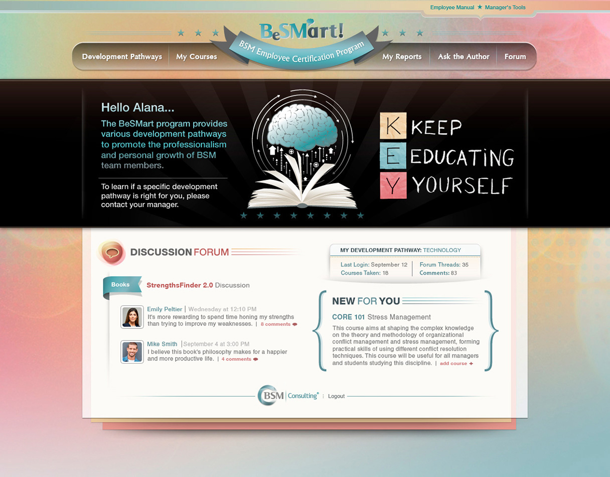 Description: Employees enroll in courses specifically designed for their pathway and become certified after passing a series of tests. Tests are scored instantly, and employees can re-take courses until satisfied with their scores. A discussion board allows employees to post and comment on continuing education topics of expertise.