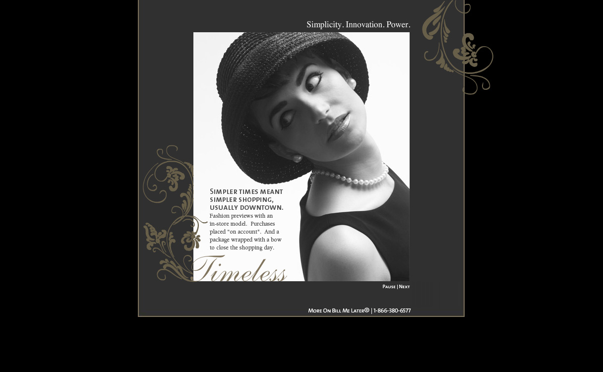 Description: Bill Me Later approaches potential high-end clients by inviting them to view a custom micro-website, hoping to lead the merchant to contact Bill Me Later for more information about implementing the solution into their retail checkout process. This micro-website, created especially for Ann Taylor, leads the viewer through a “timeless to modern” story by communicating how simple it is for Ann Taylor’s customers to use the Bill Me Later checkout solution. It also points out how profitable and easy it is for Ann Taylor to implement the Bill Me Later solution into their existing e-commerce or retail kiosk checkout systems. Because the end-product was to be viewed by potential C-Level Ann Taylor executives, I meticulously examined the message, strategy, layout, and function to ensure success.