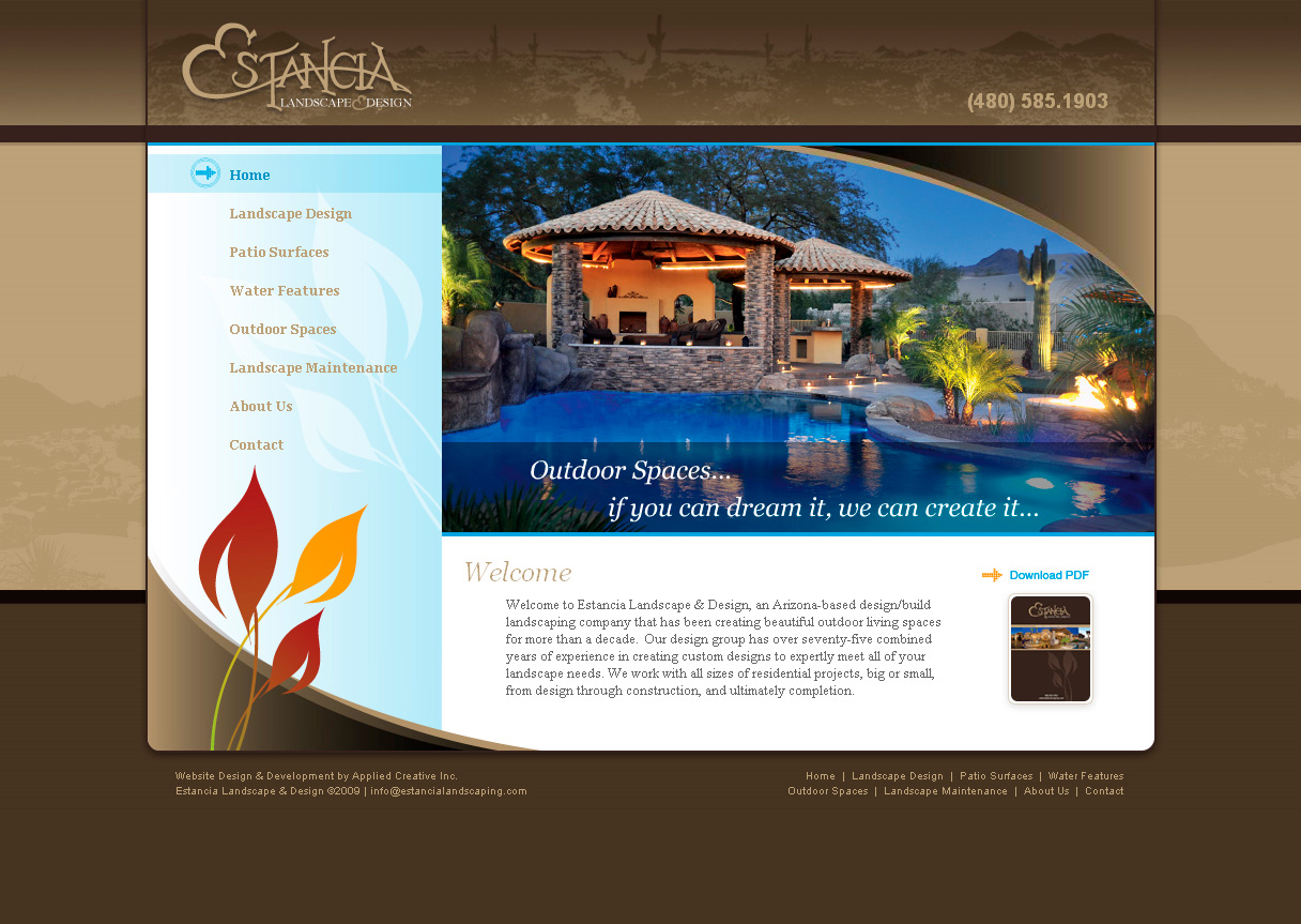 Description: Estancia Landscape & Design is a landscaping company that specializes in building custom-designed outdoor areas. Each specialty area on the website includes a slideshow of projects Estancia has developed. All images and content on the site are managed through a CMS, making it simple for the client to update to their website. I had the privilege of working with another talented designer on this project. Throughout all project phases, we communicated with each other to ensure the website was as functionally and aesthetically creative as the work Estancia produces.
